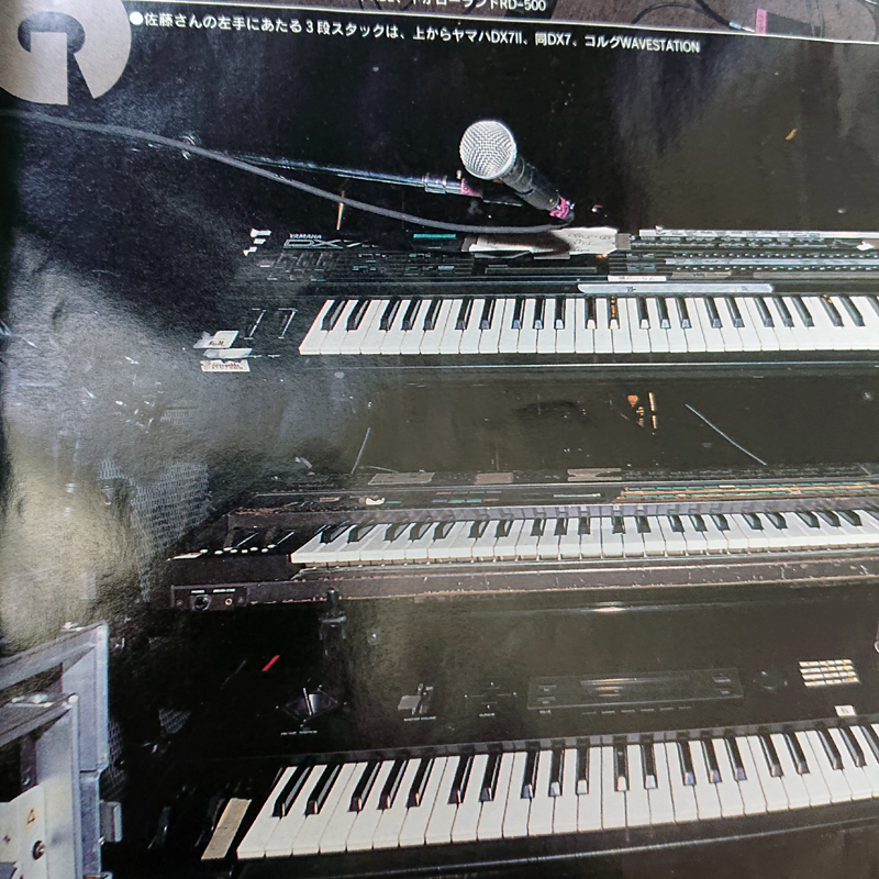 記事内で佐藤達也氏はMIDIケーブルを使わず1音色1台で済まそうセットだと言っている。シンセサウンドのシステムに関してはレイヤー音色を前提としているので仕方ないとして、ピアノ・オルガンはまさに1音色1台で済ませているようだ。KORG WAVESTATIONに関しては特に触れていなかったが、当時のシンセの中ではとても特徴的な音を出す機種だったので、単体で使われていたのかもしれない。