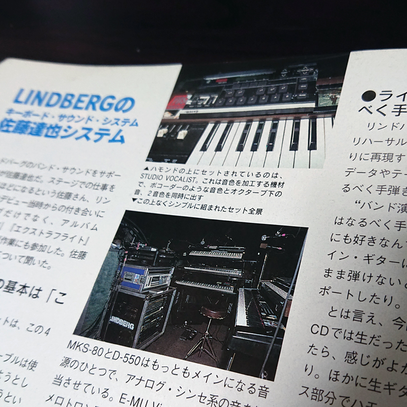 前回触れたように、この号が初めて買ったシンセ専門誌、その中でもページの前半にあったこのLINDBERGのLIVE記事はプロの機材セッティング解説を初めてみた記事でもある。そのぶんとても印象に残っている。