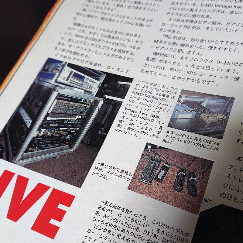 DXシリーズはどちらも1997年時点で最新の機種というわけではないが、1980年代に発売された初代から40年近く経った今でも現役で使用されている、支持の高いシンセである。記事を読むとDX7ⅡはラックにセットされたAKAI S1000(サンプラー)にMIDI接続されパッド系、ストリングス系の音色を出すためのマスターキーボードとして使用されているようである。詳しいセットアップは明記されていないが、ラックにはS1000以外にもROLAND D-550やE-MU VintageKeysなどがセッティングされているので、レイヤーで使用しているとおもわれる。